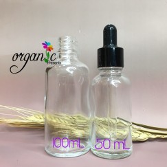 Chai đựng mỹ phẩm bằng thủy tinh trong, nắp bóp kèm ống thủy tinh nhỏ giọt.